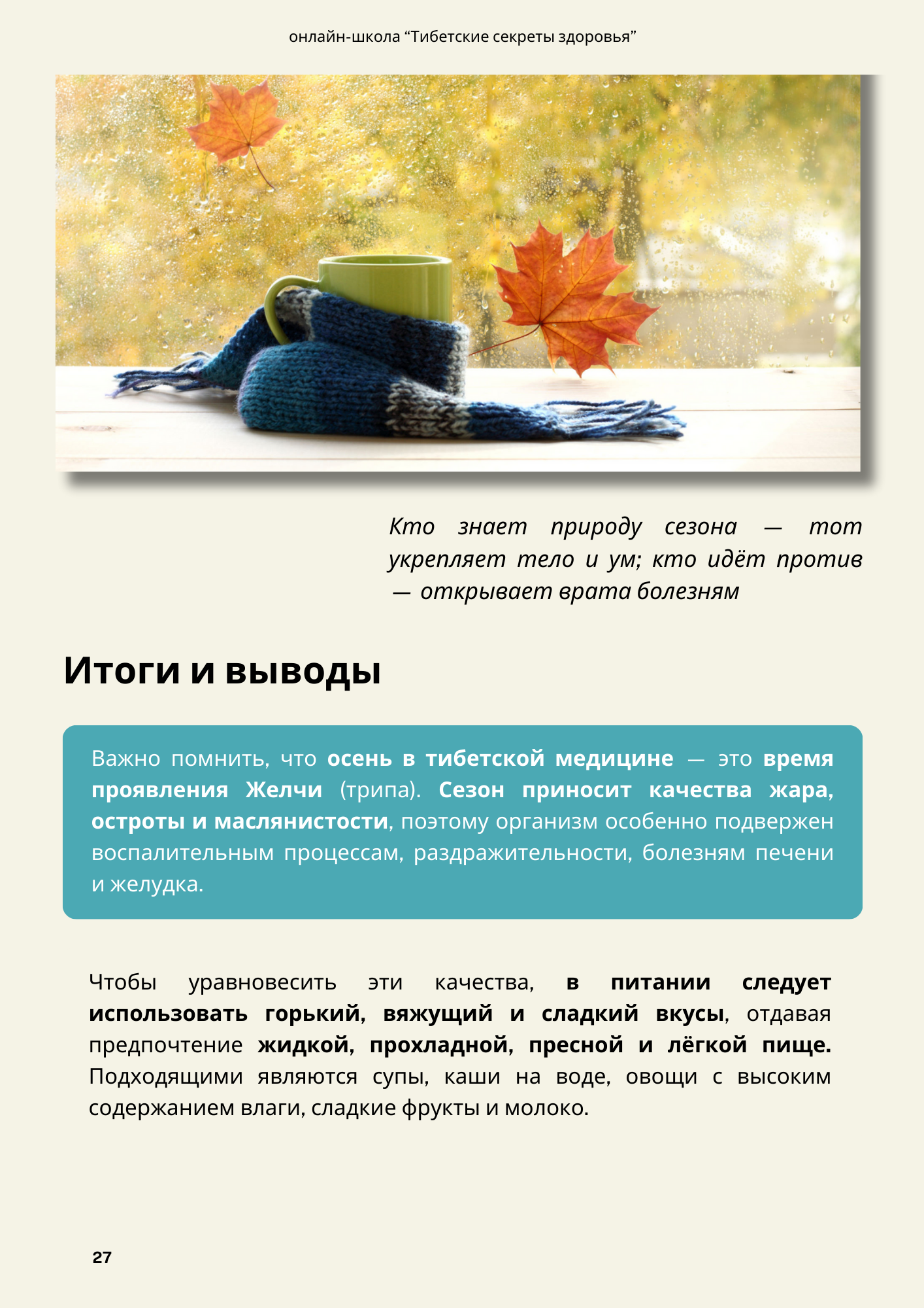 Специально для того, чтобы вы могли это исправить или предотвратить, мы подготовили для вас практическое руководство — электронную мини-книгу «Питание и образ жизни в осенний сезон. Рекомендации тибетской медицины», которая даст вам конкретные практические инструкции, основанные на древних знаниях тибетской медицины и поможет прожить осень легко и без болезней!